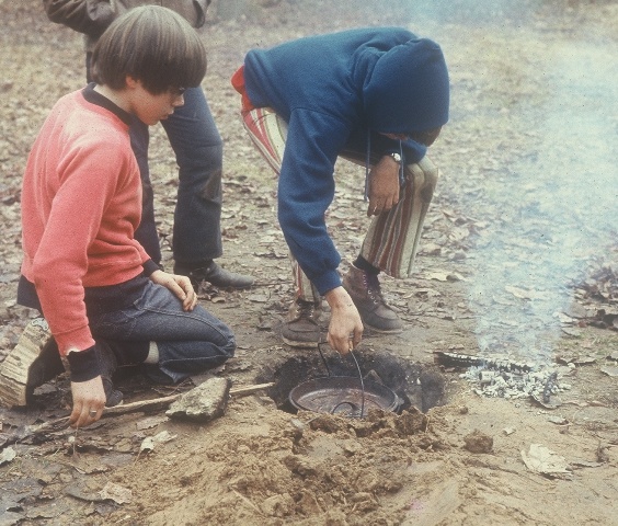 This photo shows some of the boys during a 1974 campout placing a dutch oven in a 'bean hole' for cooking. Scoutmaster Carl Hertle told how the boys would prepare supper in the dutch oven and bury it in the ground with hot coals. While the boys were out and about for the day, their supper would cook in the dutch oven.